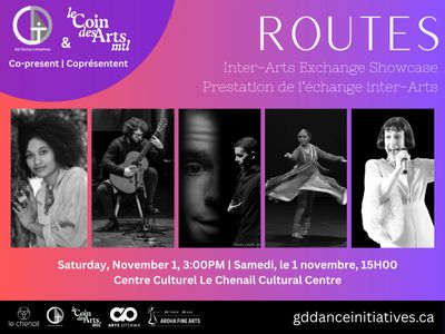 Routes : Échange inter-Arts est une coprésentation de GD Dance Initiatives et Le Coin des Arts MTL, réunissant de talentueux artistes émergents multidisciplinaires dans une vitrine d’œuvres créatives, nouvelles et existantes!